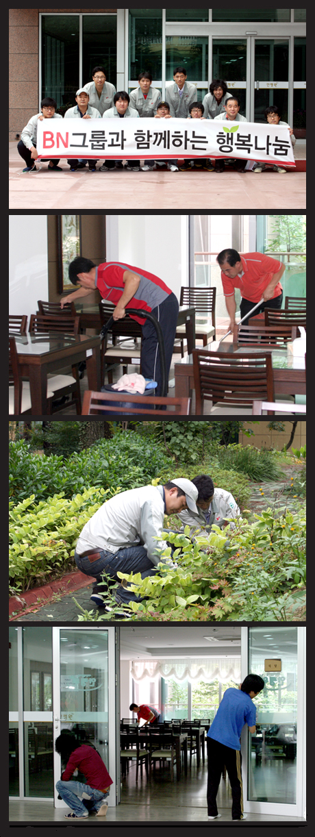 부산시 금정구 안평노인요양원에서 BN그룹이 진행 중인 자원봉사활동에 참가하여 요양원 청소 및 봉사활동을 하며 따뜻한 이웃사랑을 실천